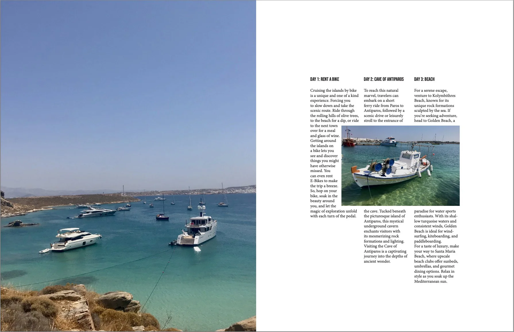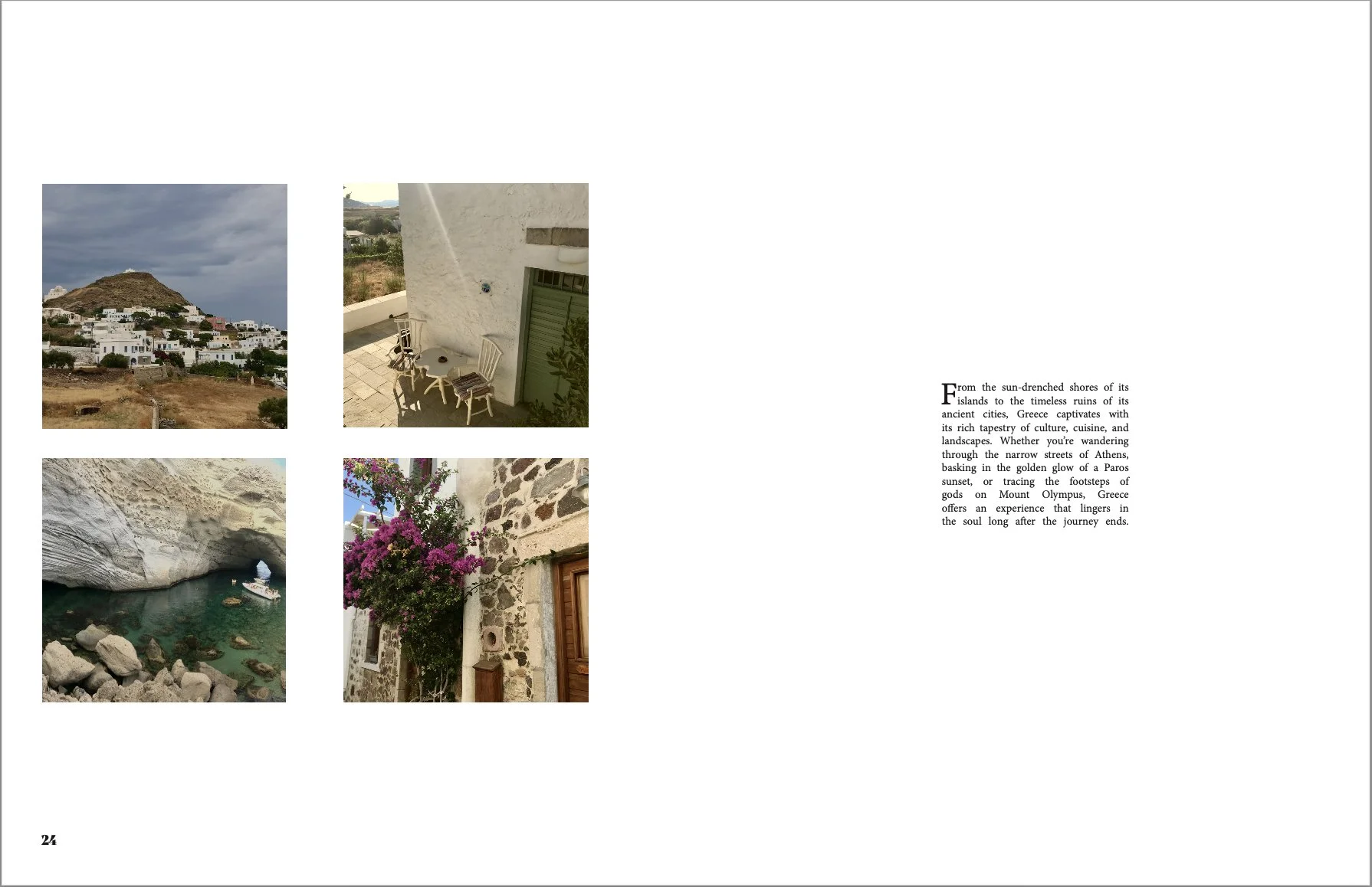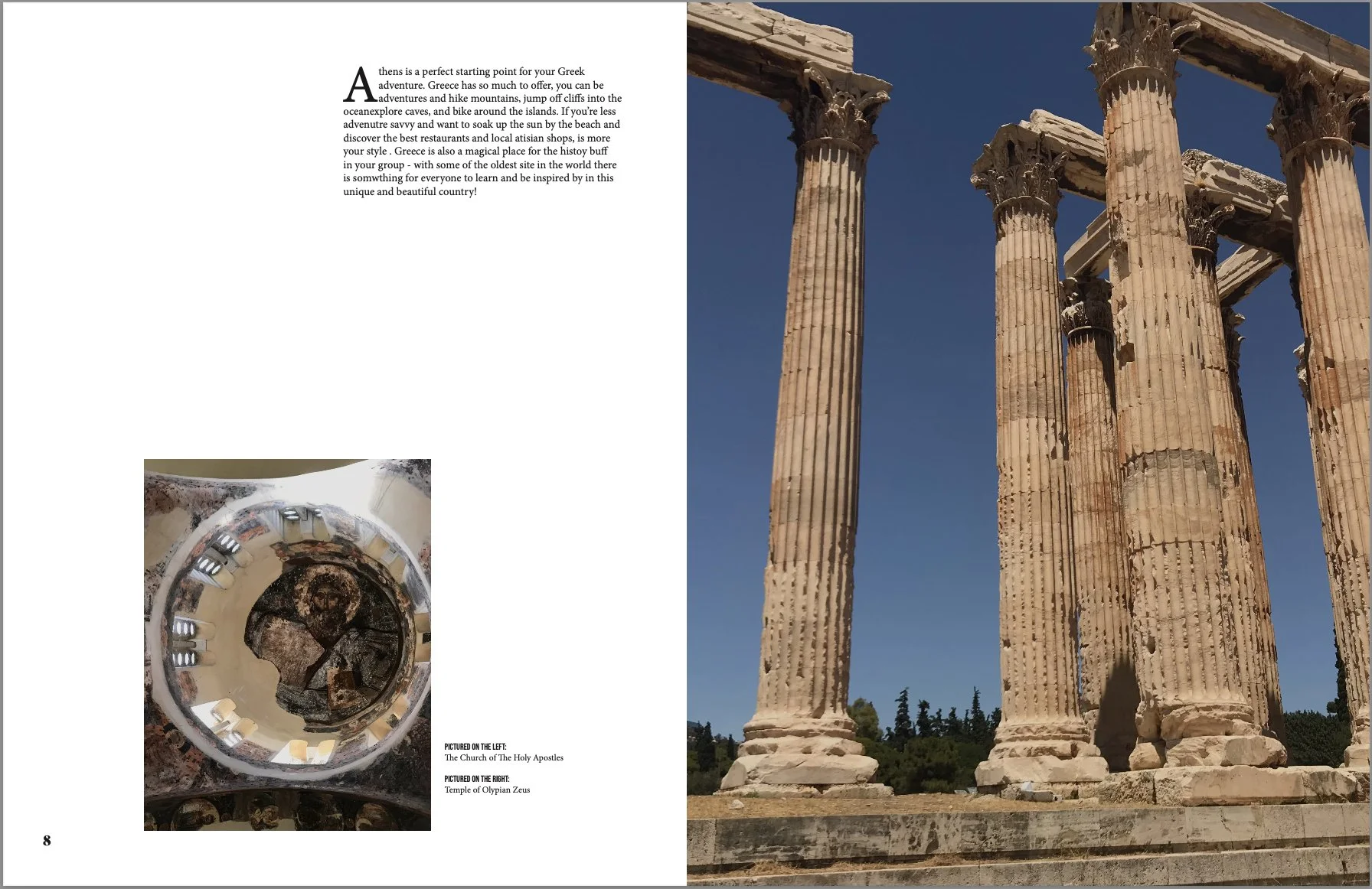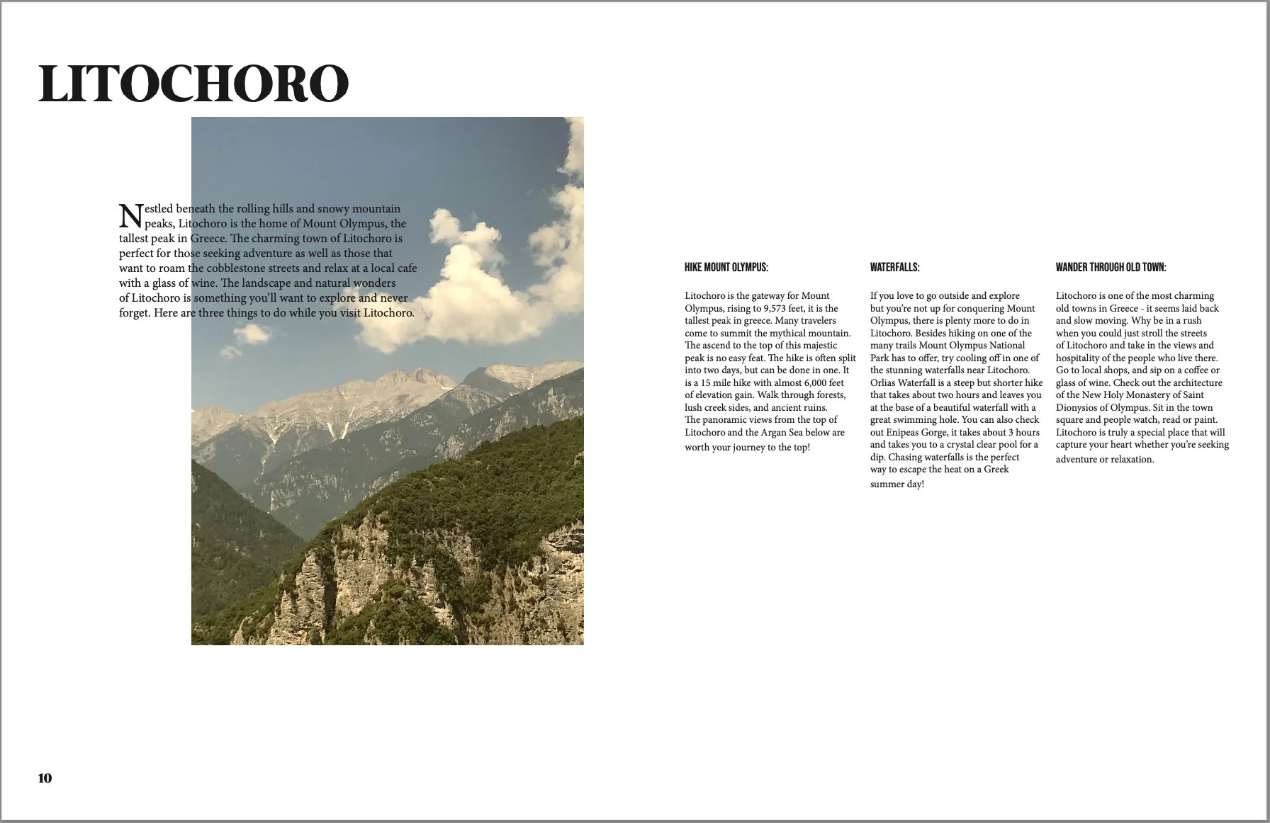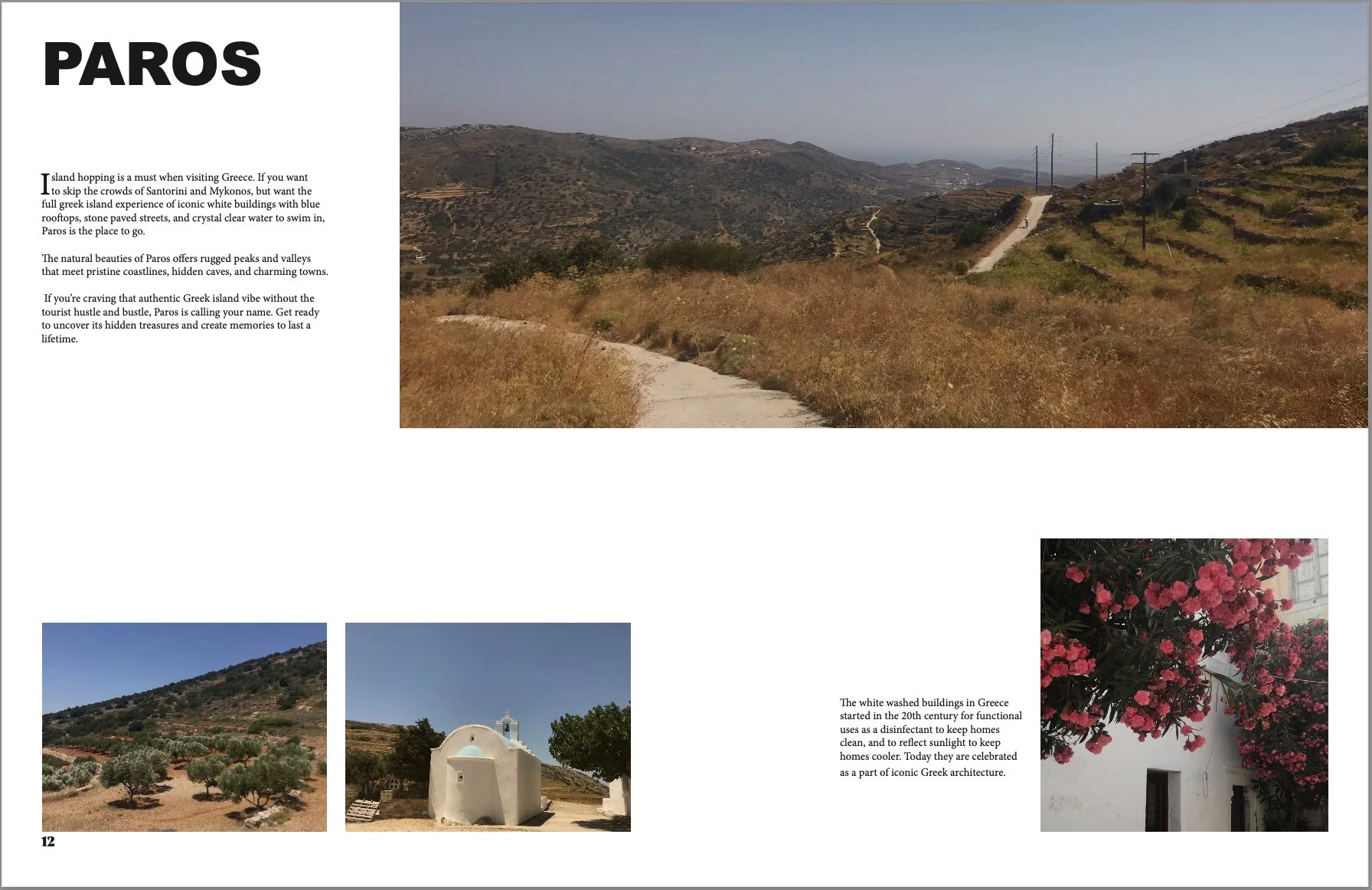 This project draws its inspiration from my travels in Greece. Through my lens and travel experiences, I have crafted my first issue of a travel magazine. My vision was to create a publication that embodies a clean, modern, and minimalistic aesthetic while providing readers with insightful recommendations on the most captivating destinations in Greece. Each page is designed to not only inform but also inspire, featuring my photography as a window into the vibrant culture, stunning scenery, and unique experiences that Greece has to offer. This magazine invites readers to explore and envision their own adventures in this beautiful country.